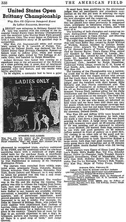The United States Brittany Championship Association, sponsors of the Championship, have tried to pattern this stake along the lines of the National Free-for-All which, because of the rugged physical demands and high standards, is generally considered to be the toughest stakes in the country to win. This stake was conceived (like the Free-for-All) for breed improvement, and intended to glorify the determined Brittany with the game-finding desire and physical attributes essential for a winning performance in an hour qualifying heat, then returning for another rigorous hour in the finals. The high, tough cover on Lake Murray courses this year was really punishing and may have made conditions even more demanding than intended.
