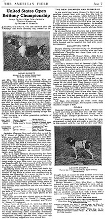Freck O Dee—Tipsy Dancer.—Freck had an excellent ground heat with three finds. He took a few jumps on the third find. Tipsy Dancer covered the course at restricted range and chased a bird.