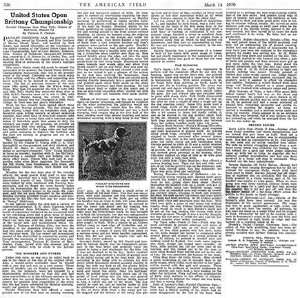 This year’s titular event did much to cement the contention of its sponsor, the United States Brittany Championship Association, that this is the premier event of the breed. Certainly no trial could enjoy a finer setting, and the officers and supporting cast leave nothing to be desired in staging this class event. The list of previous winners of the title since 1963 surely reads like the Who’s Who of Brits. Way Kan Jill garnered the title in both 1963 and 1965, Bill's Buddy Boy separated these wins in 1964, Britt’s Bazooka came on to win in 1966, with Way Kan Mandy taking the crown in 1967. Bazooka’s Brandy was the Champion in 1968, while Gringo de Britt was last year’s titleholder.