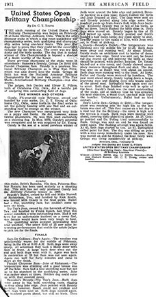 Gundy, 3 1/2-year-old male Brittany, owned and handled by your scribe, Dr. C. T. Young of Oklahoma City, Okla., came forth in the final series to set the gallery buzzing with one find and an outstanding race to emerge as the winner. The new Champion was campaigned very little as a puppy and Derby. He did, however, amass twelve placements. He was then used exclusively as a shooting dog. In May, 1970, Gundy’s potential was recognized and he was acquired by Dr. Young. Gundy is the son of a noted previous winner of this stake, Britt’s Bazooka. His dam, Princess Shabur Rocaro, has been used entirely as a shooting dog. This nick has not only produced Gundy but the Brittany Futurity winner in 1969.