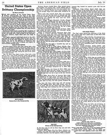 The 1973 rendition of the United States Open Brittany Championship was held at the Lake Murray grounds, Ardmore, Okla., on March 19-22. This year’s winner, Ban Dee, owned by W. E. Oliver of Blue Springs, Mo., turned in a sterling all-age performance. During his hour, the orange and white six-year-old ran a beautiful forward race, using terrain and wind to his advantage on all occasions. He officially recorded one find, a back, and was on point at pickup time, but only a rabbit was seen leaving. His handler, Loyd Budd, found him standing near the water’s edge on his firsl find and the birds were flushed from the reeds several feet out in the water.