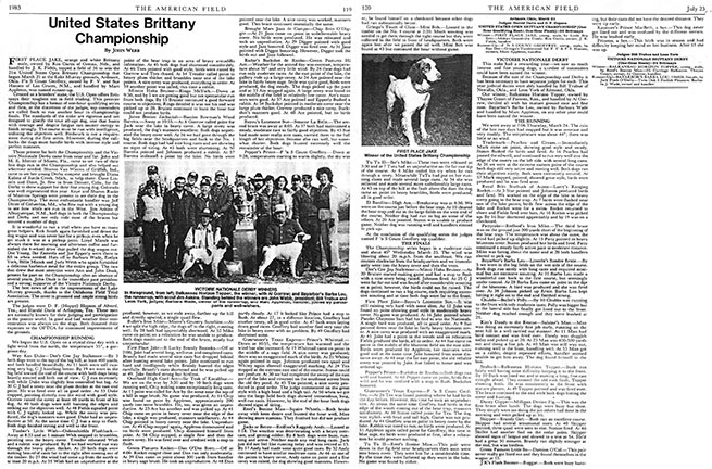 First Place Jake, orange and white Brittany male, owned by Ron Curtis of Gretna, Neb., and handled by J. K. Fields, topped a field of 36 to win the 21st United States Open Brittany Champion-ship that began March 21 at the Lake Murray grounds, Ardmore, Okla. F & S Count Geoffery, owned by F. V. and Sue Hansen of Las Cruces, N.M., and handled by Marc Appleton, was named runner-up.