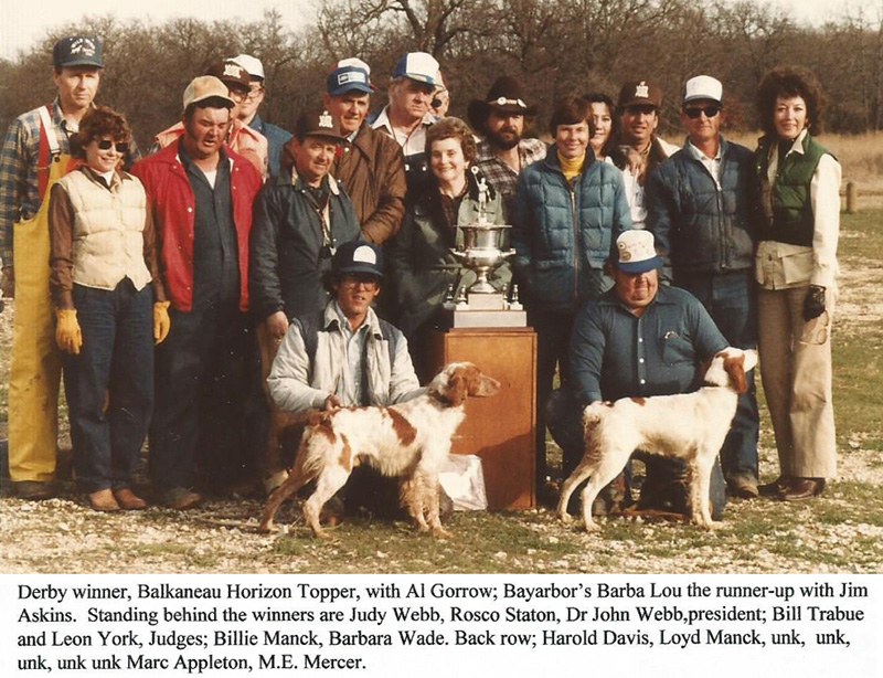 It is wonderful to run a trial when you have so many great helpers. Rick Smith again furnished and drove the dog wagon and was never late for a pickup; even when he got stuck it was at a pickup point. Lloyd Manck was always there for morning and afternoon coffee and furnished the 4-wheel drive that pulled the dog wagon out. Doc Young, Ike Zamrzla and Joe Epperly were there to fill in when needed. Hats off to Barbara Wade, Evelyn York, Billie Manck and Judy Webb who again furnished a delicious barbecue meal for the entire group. The two that drew the most attention were Ann and John Doak, present for part on the Championship after an absence of several years. John Doak is the immediate past president and a strong supporter of the Victoire Nationale Derby.