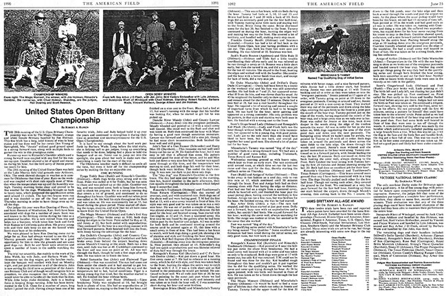 The only one-hour Derby stake for Brittanys again drew a good entry. A lot of fine young dogs with potential for future open competition competed and were impressive. However, the judges felt that none of the contenders put together a complete hour performance, therefore, they chose to name first, second and third winners. Their evaluation was that any of the three placing dogs could have been named champion of the stake had they been able to maintain their performance the entire hour.
