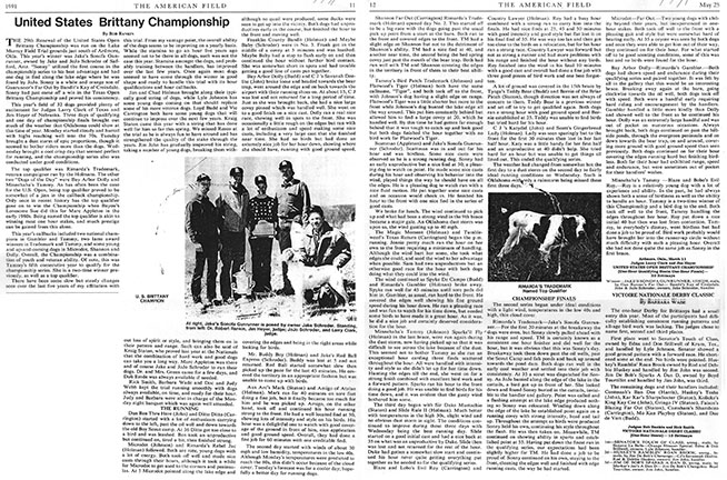 The 29th renewal of the United States Open Brittany Championship was run on the Lake Murray Field Trial grounds just south of Ardmore, Okla. This year’s winner was Jake’s Sonofa Gunrunner, owned by Jake and JoJo Schroder of Safford, Ariz. “Sonny” utilized the first course in the championship series to his best advantage and had one dug in find along the lake edge where he was found by JoJo. Sonny is a white and orange son of Gunrunner’s Far Out by Bandit’s Kay of Croixdale. Sonny had just come off a win in the Texas Open Brittany Championship and proved his consistency.