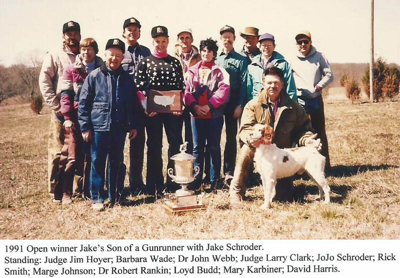 Rimarda’s Trademark—Jake’s Sonofa Gunrunner.—For the first 20 minutes at the breakaway the dogs were even, but Sonny slowly pulled ahead with his range and speed. TM is certainly known as a consistent one hour finisher and did well for the hour, but it was obvious that this was Sonny’s day. Breakaway took them down past the oil wells, past the Scout Camp and fish ponds and back up around towards the pond dam. Both dogs ran well in the early cool weather and settled into their job with consistency. At 35 a scout was dispatched for Sonny. As JoJo hunted along the edge of the lake in the cattails, a bird got up in front of her. She looked down and found Sonny buried in the cattails, invisible to the handler and gallery. Point was called and a flushing attempt at the lake edge produced nothing so Sonny was relocated. Winding down along the edge of the lake he established point again on a running covey with strong intensity, head and tail up. Throughout the attempt as birds were produced Sonny held his own, continuing his style throughout the flush. He was then taken on. Meanwhile, TM continued on showing ability in spurts and established point at 55. Having put down the finest run in the qualifying series, our expectations had been slightly higher for TM. He had done a job to be proud of. Sonny continued on his own, staying to the front, cleaning the edges well and finished with edge running casts, the way he had started.