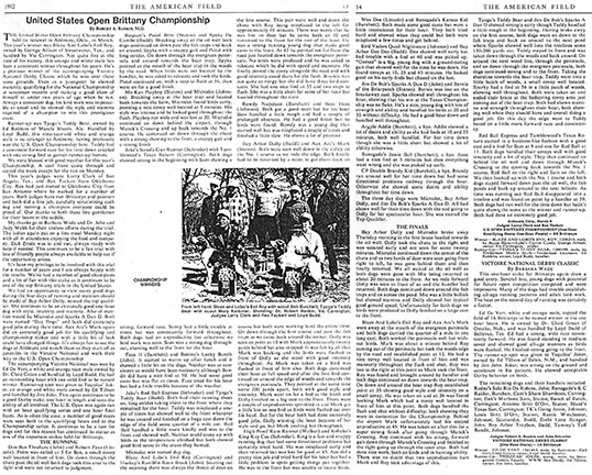The accompanying Victoire National was won by Ed De Vert, a white and orange roan male owned by Dr. Cloid Green and handled by Loyd Budd. He had an outstanding hour with one solid find to be named winner. Runner-up spot was given to Tequilas’ Joker. an orange and while male owned by Ed Tillson and handled by Jim John. This again continues to be a good Derby stake, one hour in length and tests the ability of all involved. The U.S. Open was again run with an hour qualifying series and one hour final heats. As is often the case, a number of good races were seen both in the qualifying heats and in the Championship series. It continues to be a test for dogs and for this reason has continued its status as one of the important slakes held for Brittanys.