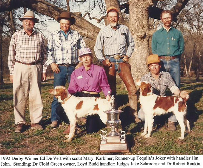 Ed De Vert, white and orange male, topped the field of 16 Brittanys to be named winner in the one hour heats. He is owned by Dr. Cloid Green of Omaha, Neb., and was handled by Loyd Budd of Bellevue, Tex. Ed had a strong, wide race consistently forward. He was found standing in medium cover and showed good all-age manners as birds were flushed. He finished strong going to the front.
