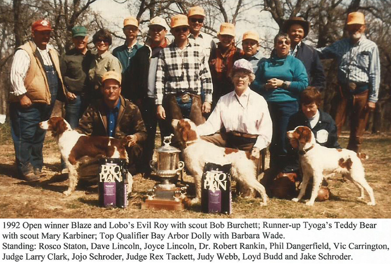 We were blessed with good weather for this year's Championship. A cool front came through and stayed the week except for the run on Monday. This year’s judges were Larry Clark of San Angelo. Tex., and Rex Tackett from Oklahoma City. Rex had just moved to Oklahoma City from San Antonio where he worked for a number of years. Both judges have run Brittanys and pointers and both did a line job. carefully scrutinizing each dog and naming a champion everyone could be proud of. Our thanks to both these line gentlemen for their hours in the saddle.