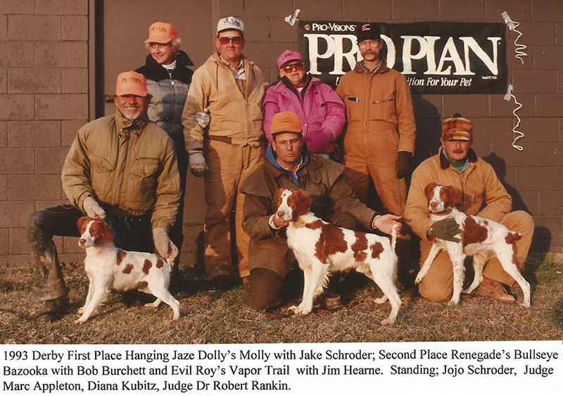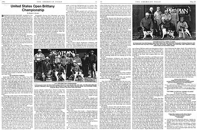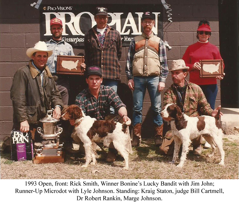 Bonine's Lucky Bandit, handled by Jim John and owned by Herb Rea of Wichita, Kan., won the 1993 U.S. Open Brittany Championship at Lake Murray at Ardmore, Okla. This four-year-old liver and white male exhibited consistency throughout his initial hour and during the finals to garner his prestigious win. Sired by Bonine’s Count Bud out of Bonine’s Cassandra Crossing, the breeder was Herman Bonine, who owned the dog through his early years until Herb Rea saw him run at a trial at age three. At that time Herb purchased Bandit and put him in the string of Jim John. He has been a consistent winner since that time, best known for his steady forward pattern and style on birds.