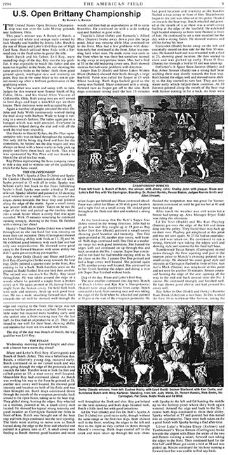 The United States Open Brittany Champinship was run over the Lake Murray grounds near Ardmore, OkIa. This year’s winner was A Bunch of Butch, a four-year-old white and orange male owned by Jack Murphy and handled by Jimmy John. Butch is the son of Blaze and Lobo’s Evil Roy out of High Card Sara. Butch utilized three finds with a forward race in the final series to garner the title.