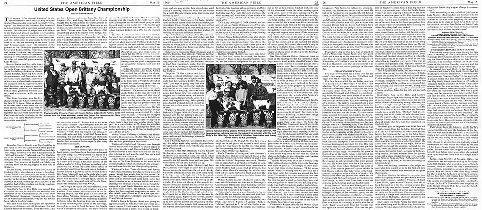 Franklin County Bandit was Top Qualifier in this stake in 1987 and came back to these grounds later in the year to win the National Championship. The Magic Moment won this Championship in 1990 and Rimarda’s Trademark was Top Qualifier in 1991. Rimarda’s Trademark was recently inducted into the Brittany Hall of Fame in Grand Junction. Tony Vescoso of South Lyon, Mich., can certainly know that his dog topped the best field of Brittanys.