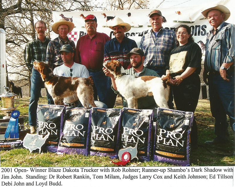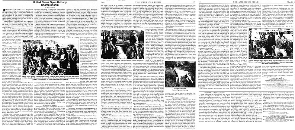 Blaze Dakota Trucker, a deep orange roan male, coming seven years of age, has won the 2001 running of the United States Open Brittany Championship. The talented six-time champion was handled by Rob Rohner for owner Randy Walth of Hawarden, la. Runner-up was Shambo’s Dark Shadow, run by Jim John and owned by Phillip Dangerfield of Tampa. Fla.