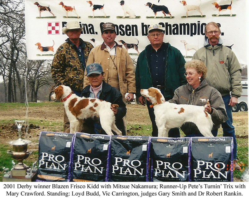 The 2001 winner is Blazen’s Frisco Kid, white and orange male owned by Barbara and Mike Huska of Southlake, Tex. Vic Carrington handled him. Runner-up was Pete's Turning Trix, also from the Carrington string. Mary and Jim Crawford, outstanding Houston. Tex., devotees, own him.