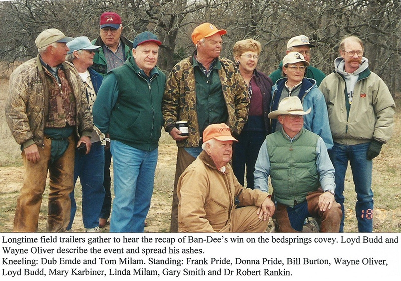 • Nostalgia and history were honored here this week. A group of long-time field trialers journeyed out to the Bear Trap meadow to the site of what is referred to as the “bedsprings covey”. Wayne Oliver and Lloyd Budd spread the ashes of the legendary BAN-DEE across the area. This was the location of the find that iced the dog’s second consecutive National Brittany Championship, an accomplishment that has never been duplicated. In a brief informal ceremony, Lloyd retraced his flushing steps and gave a play-by-play of that great moment in Brittany history. It was a touching display of nostalgia for a group of people not generally given to displaying such emotions.