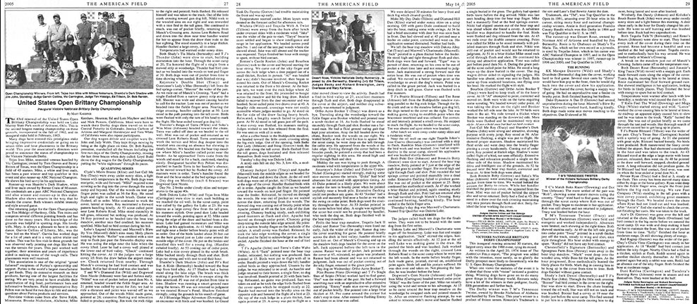 As written in the April 20, 1974 issue of The American Field report, "The program was added with the intention, most surely, as to glorify the Derby prospect most likely to theoretically win the U. S. Open Brittany Championship."