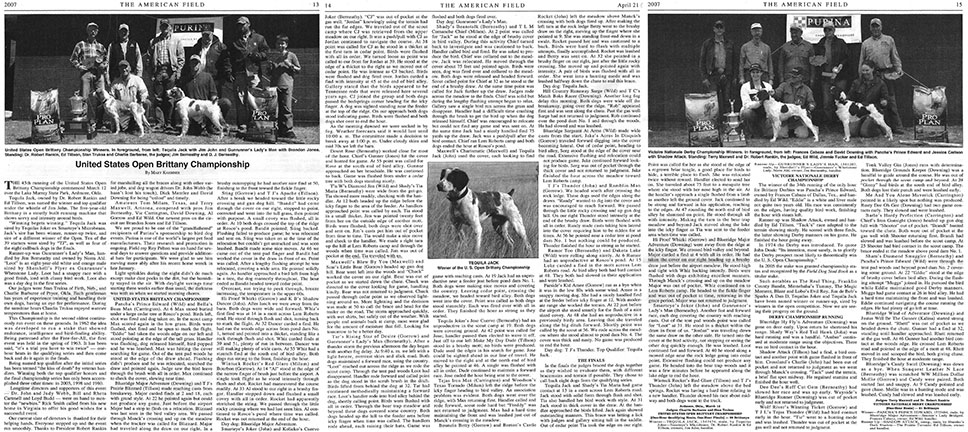 The 45th running of the United States Open Brittany Championship commenced March 12 over the Lake Murray State Park, Ardmore, Okla. Tequila Jack, owned by Dr. Robert Rankin and Ed Tillson, was named the winner and top qualifier under the whistle of Jim John. The five-year-old Brittany is a stoutly built running machine that shows savvy and intensity around birds.