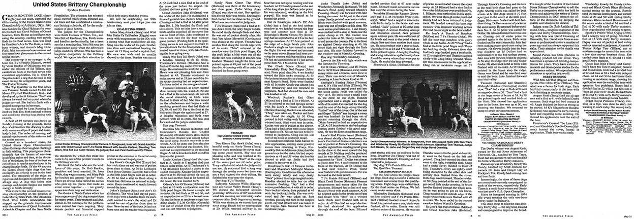 Grand Junction Jake, a classy eight year old male, captured the 49th running of the United States Open Championship at Ardmore, Oklahoma. Jake was handled by Chad Holman of Illinois and owned by Dick and Carol Pulliam of Tennessee. He ran an intelligent race using the country, carding two stylish finds in the final series. Jake was sired by Gambler’s Ace In The Hole, a multi-hour winner and Auten’s Meg-netic Field. As of this running Jake has amassed one amateur and four open hour placements in the current spring season.