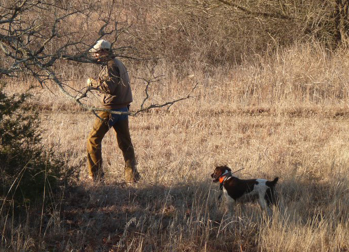 Jacks Tequila Jake, John and Wimberley Jimdandy, Johnson. Both dogs were off with gusto. We left Rosco’s Pond going toward Manck’s Crossing. Dandy was forward with Jake hitting the cover. At 14’ just in the scout camp Dandy pointed near some cedars. Birds were flushed with good manners. Jake had been out of pocket at this time. We went across the pond dam # one and Dandy was credited with a stop to flush near the cedar clump at 25’. The tracker was called for Jake at 30’. Dandy continued to roll across the country. Far to the front of us we sighted Dandy standing at 40’. He stood high and tight through the flush and shot. His race finished forward in the meadow out of Manck’s Crossing.