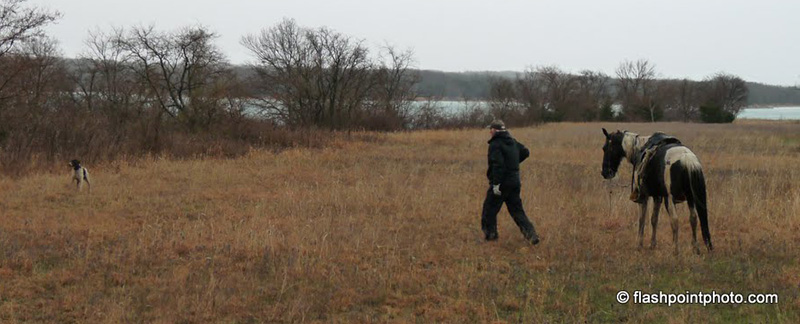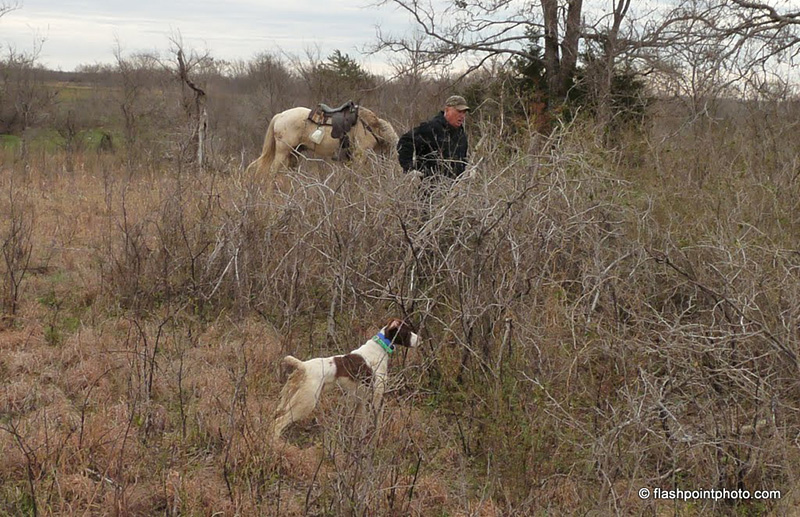 Tequila's Barbed Wire (Tillson) and Wimberley Rowdy Bo Dandy (Johnson) worked the cover. After we crossed pond dam No. 4 point was called for Rowdy in a cedar stand. A short distance away “Trouble” also pointed. At the flush and shot of the bracemate’s birds she left in pursuit. Rowdy shortened his race near the end of the hour.