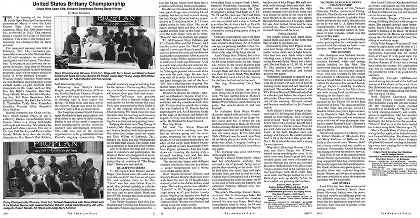 The 51st running of the United States Open Brittany Championship commenced March 4 over the Lake Murray State Park courses near Ardmore, Okla. The 50th Anniversary was celebrated in 2012. This renewal began a second fifty years of field trial tradition. This event is the longest continuously run championship on these grounds.