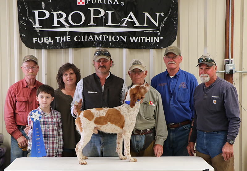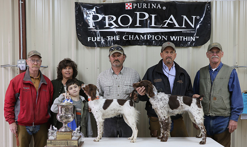 Named Champion was FC/AFC/GFC Kinwashkly Fat Bastard, "Fatz", handled by Tom Tracy and owned by Bo Ackerman of Clermont, GA and Leslie Andreas of Saskatchewan, Canada. Fatz is a 9 year old white and orange male sired by NFC/FC/AFC Leas Running Jay Hawk and Kinwashkly French Valor. Fatz set a high standard of performance for his Championship title with intense style and impeccable manners on his birds and a strong, fast, forward ground race which was just what the judges were looking for.